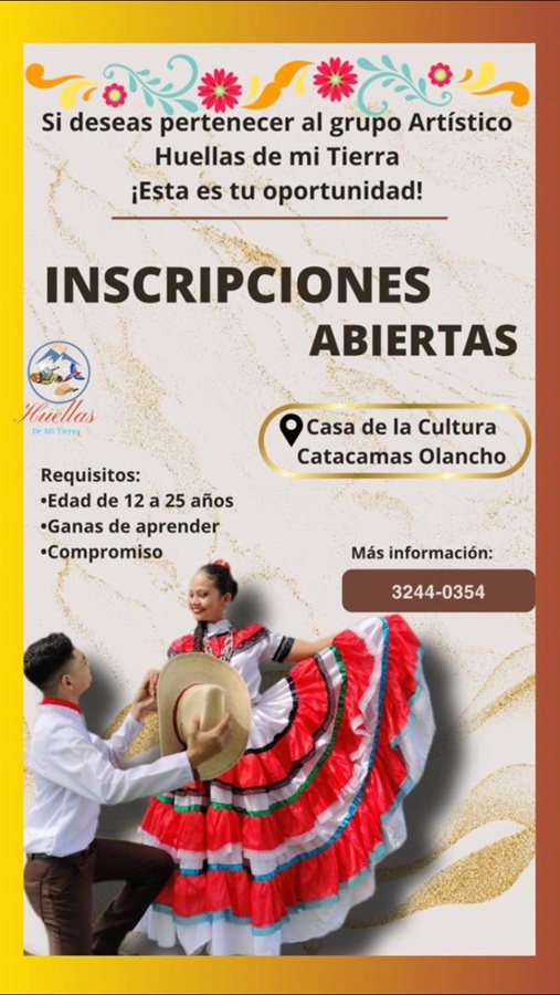 Viernes 28 de febrero, tendremos ensayo a las 5:30 PM en la Casa de la Cultura de Catacamas. Además, ensayamos todos los viernes a la misma hora. Te invitamos a formar parte de nuestro Grupo Artístico Huellas de Mi Tierra y vivir la pasión por el arte y la cultura. ¡No te lo pierdas!