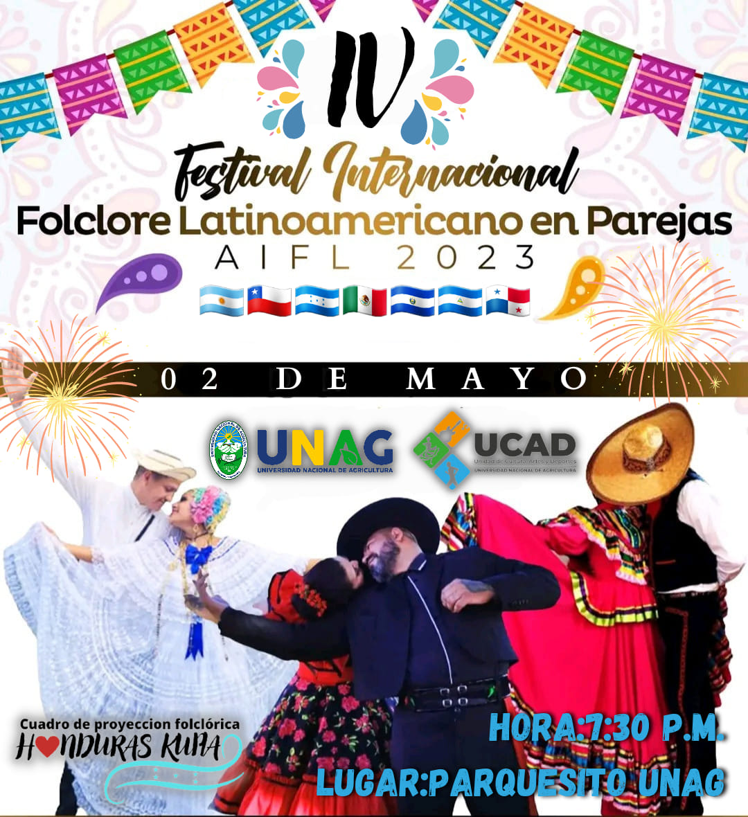 Nos place informar que el día martes 02 de mayo seremos sede para celebrar el IV Festival Internacional de Folclore Lationamericano en Parejas, dicha actividad esta siendo dirigida por la Unidad de Cultura, Artes y Deportes (UCAD) y el Cuadro de Proyección Folclórica Honduras Kupia de nuestra amada Universidad Nacional de Agricultura (UNAG), bienvenidos desde ya a nuestra casa de estudios.