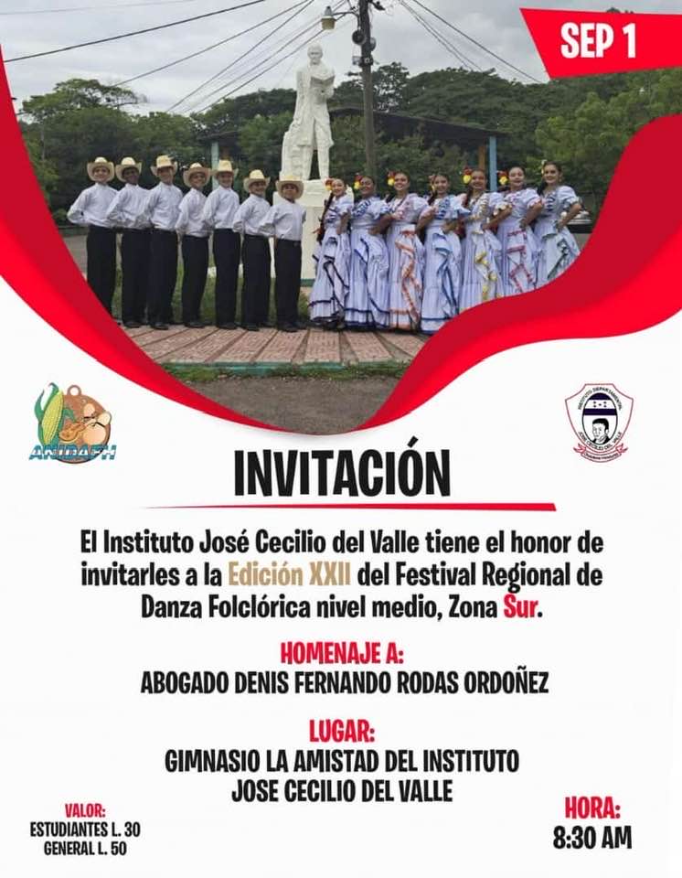 La zona Sur de Honduras a través del Instituto José Cecilio Del Valle, les invita a su XXII Concurso de Danzas Folcloricas del nivel medio para que participen de esta gran fiesta folclórica.