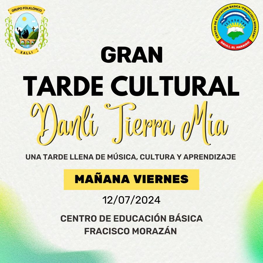 Nos complace invitarlos a nuestra tarde cultural "Danlí, Tierra Mía", un evento donde celebraremos la riqueza cultural y las tradiciones de nuestra querida ciudad, trabajando de la mano con el CENTRO BASICO FRANCISCO MORAZÁN.