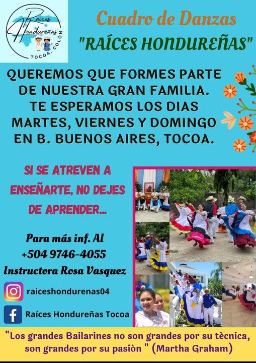 Si quieres formar parte de esta familia folclórica y vives en Tocoa Colon . Cordialmente invitados e invitadas. Comunícate con nosotros para mayor información y únete a estas vivencias , convivencias y aprendizajes que nos ofrece este rubro artístico.