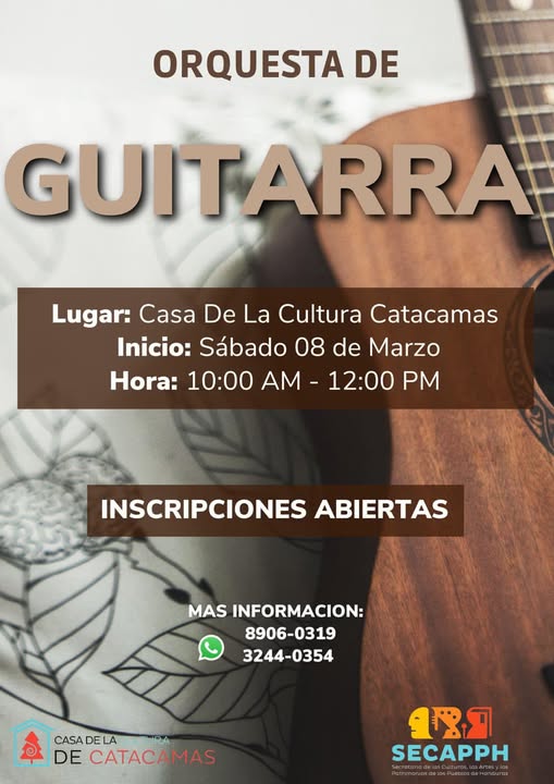 La Casa de la Cultura de Catacamas te invita a formar parte de nuestra orquesta de Guitarra. Sé parte de los 15 talentos que estamos buscando, con edades entre 10 y 22 años.